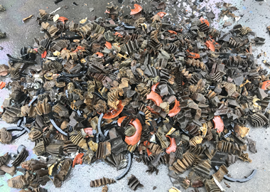 濾油器通過四軸撕碎機進行初級破碎,破碎成60mm塊狀,通過震動篩,使出料的成品均勻到下個工段,同時把里面的油震出來。經磁選機將物料中的鐵跟紙分離,廢鐵通過錘式破碎機破碎成小的球狀,再清洗烘干變成純干鐵,油紙則經過脫油變成干紙。